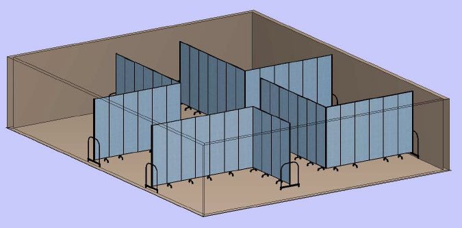 FREEstanding dividers (shown below) work together to create 4 classrooms. In the floor plan, the customer used 2 right hand & 2 left hand partitions to get the layout they needed for their room.  A right-hand unit’s first panel will bend towards the right, where a left-hand unit’s first panel will bend towards the left.