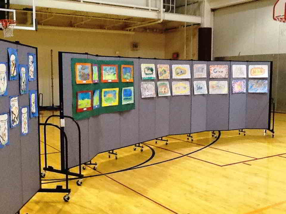 Stephanie Eckels, Principal of Stratton Elementary School in Champaign, IL sent us some great pictures of their newly arrived Screenflex portable dividers and told us how much they liked using them for their monthly student artwork display. The re-pinnable surface is perfect for hanging student work using push pins, staples, thumb tacks or claw clips. Stratton Elementary chose two 11 panel units in a soft gray smoke fabric, but Screenflex dividers are available in 36 sizes and 38 colors from which to choose, and our design consultants are available to help you pick what fits your needs and budget. She tells us