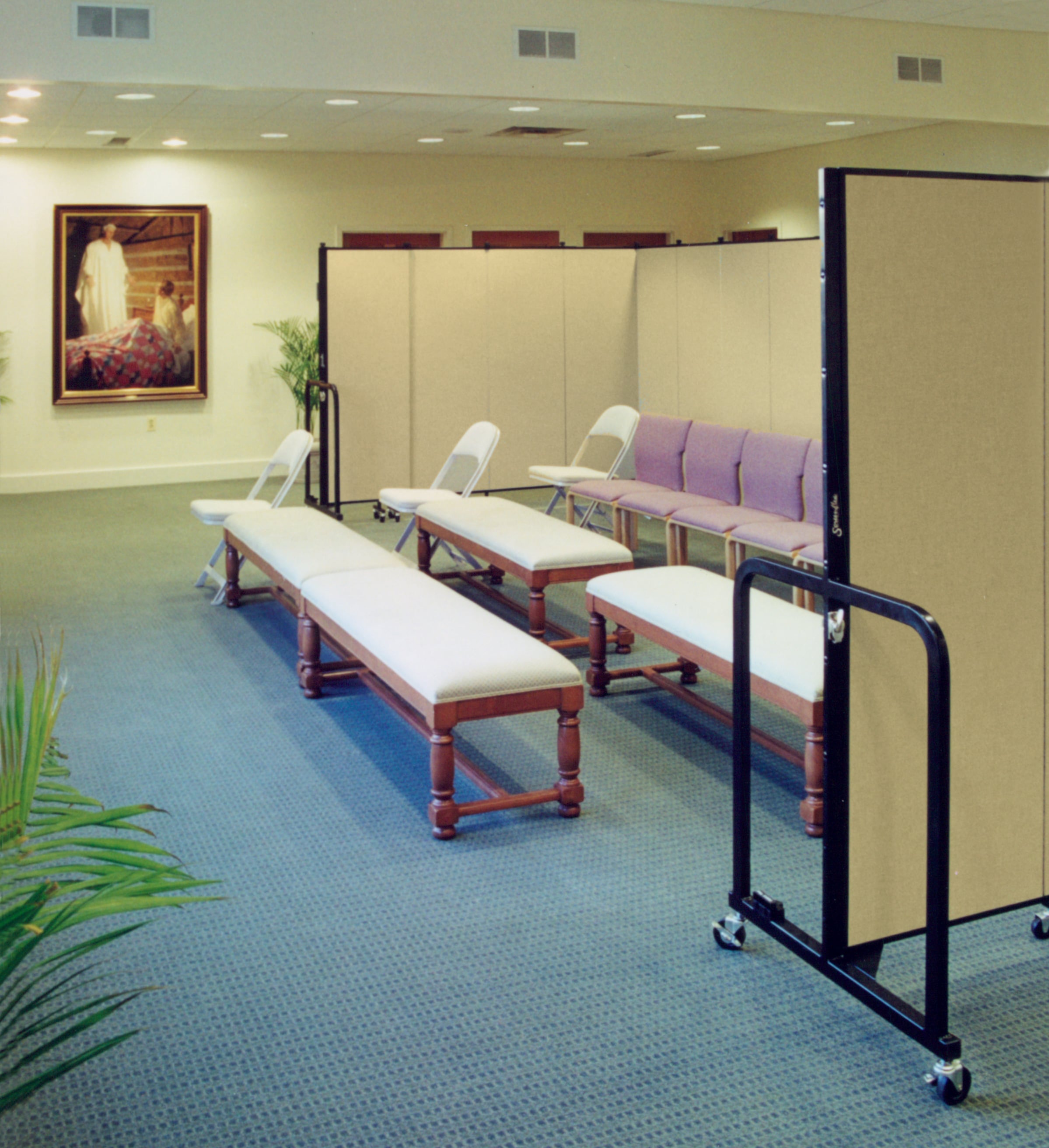 Studies have shown that nursing home residents thrive through interaction with individuals and the constant stimulation of the mind and spirit. With this in mind, it is important to create a room for nursing home residents to gather for collective worship each week. This nursing home uses Screenflex Room Dividers to create a church in their multipurpose room. Because many residents look for visual clues to identify the space as a church, hang religious images and meaningful symbols on the fabric walls. Items can be tacked or stapled directly on the panels without damaging the fabric. For heavy items consider purchasing the Screenflex Artwork hanger. This 45” long steel hook installs by placing the hanger over the top of any Screenflex Room Divider. Or add an antimicrobial coating to the units to help prevent germs from spreading.