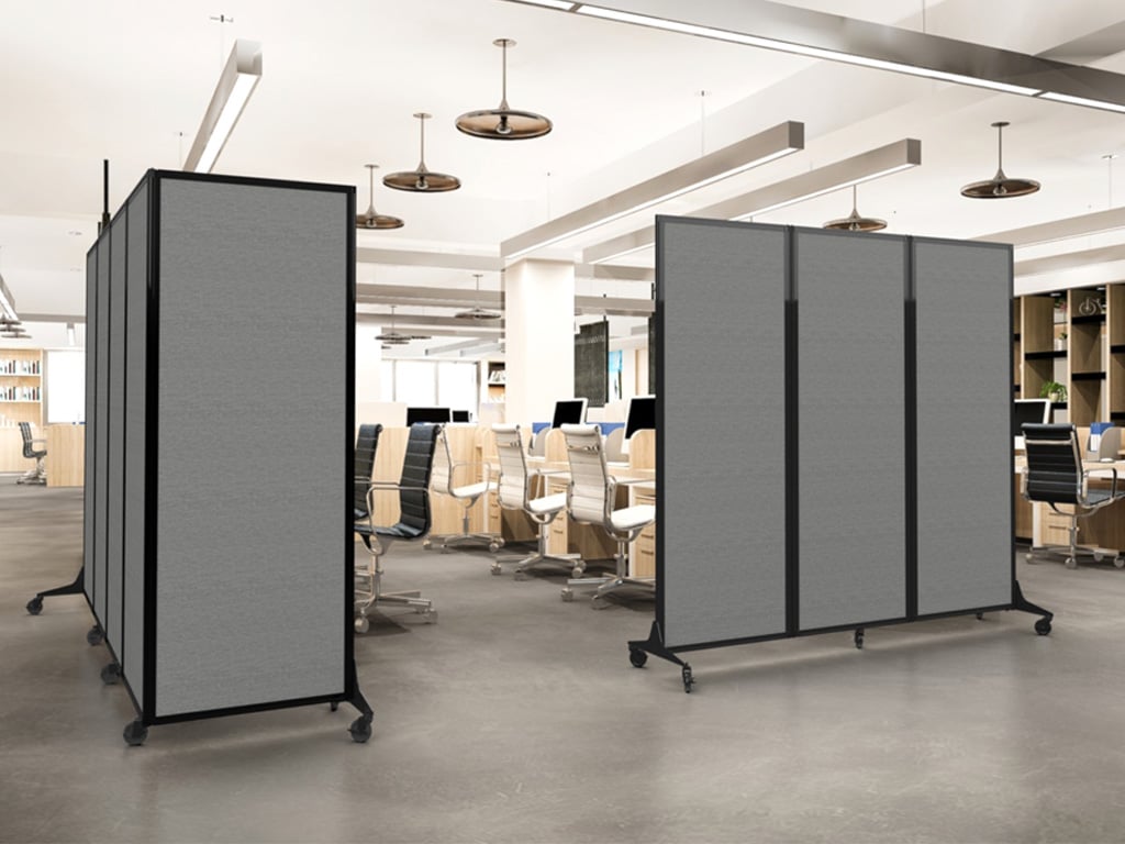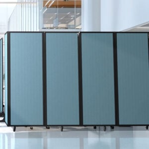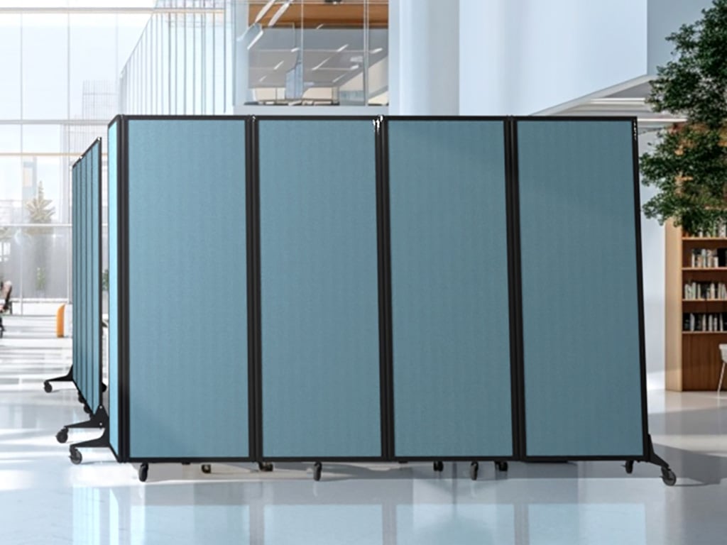 Each panel features noise-dampening acoustical fabric and self-leveling caster wheels for smooth mobility on uneven floors. The patented 360-degree hinge allows versatile configurations, while its durable, low-maintenance construction ensures lasting performance.