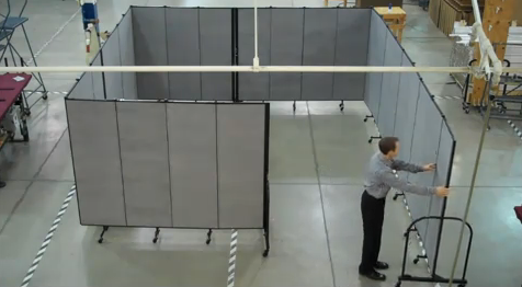 Video Transcript: Hi, this is Steve with Screenflex Room Dividers. This video will help to illustrate the versatility and the ease of setup of our Standard room dividers. A corner is made by simply bending a panel at a hinged point. Making a “T” connection is as simple as butting one divider against another divider. To make a door at a closed space, move the panel on the end or move two panels to make a double door. To store a divider, gather the panels together one by one. They will clasp shut. They can be rolled into the storage area. As you can see the panels alternate turns left, right, left, right, as the divider folds up like an accordion. The latch latches to keep them shut when rolling. Even the longest divider can be folded into the same approximate 2′ x 3′ storage footprint. Notice that the frame on the ends of the dividers can be nested together so that more than one divider can be stored in a very small storage area. Thank you for watching. Screenflex FREEstanding room dividers nest together easily. See the photos below. Easy Set Up Dividers Storing Dividers